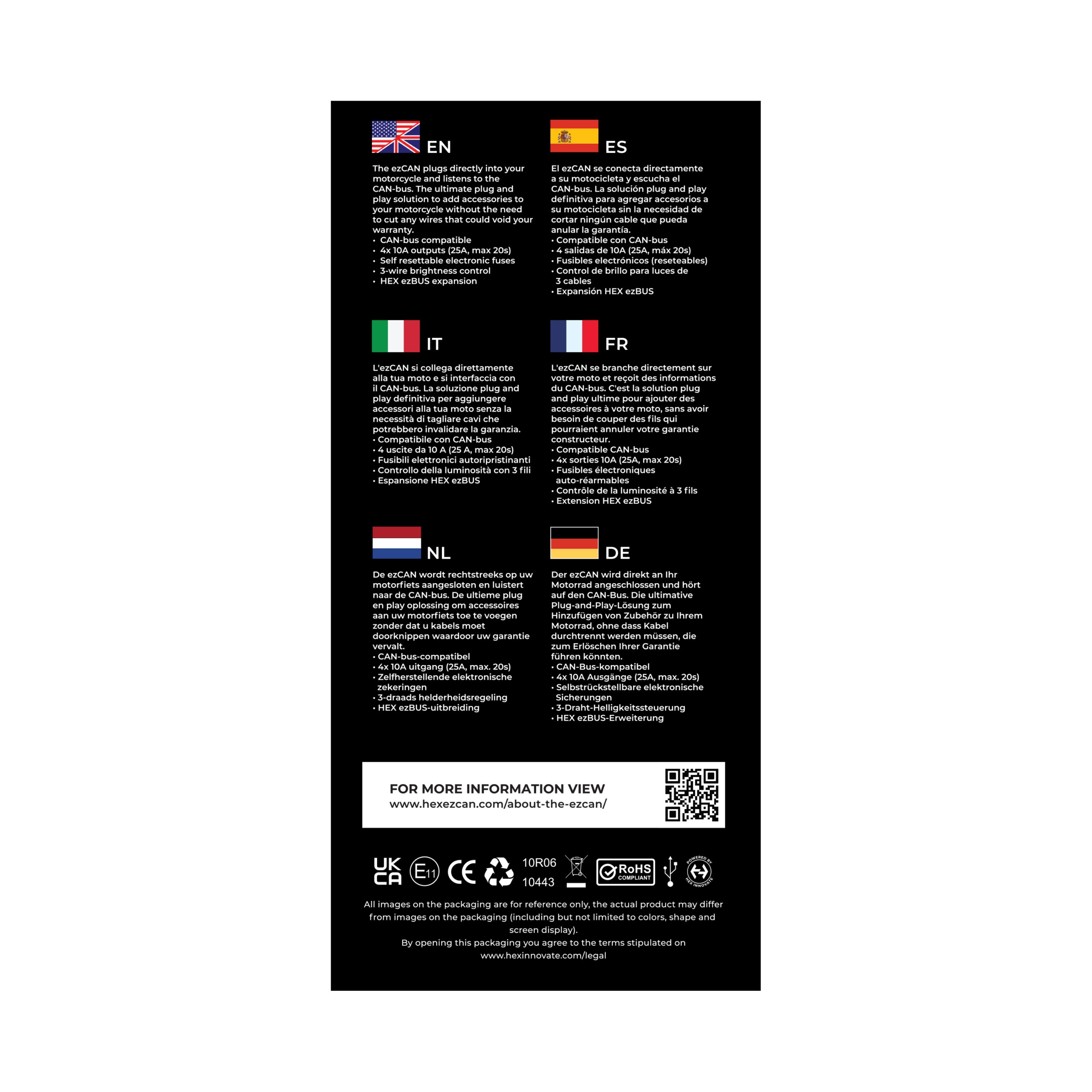 Menedżer akcesoriów HEX ezCAN pozwala na dodawanie i konfigurowanie dodatkowych akcesoriów bez naruszania fabrycznej instalacji motocykla i przecinania jego przewodów. Szybko i prosto można zamontować dodatkowe światła, klakson pneumatyczny czy ostrzegawcze światło stopu, które sprawiają, że jazda motocyklem staje się jeszcze bardziej bezpieczna.